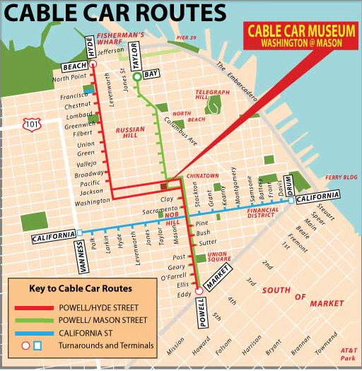 파웰 스트리트 노선(Powell-Hyde & Powell-Mason): 이 노선은 한쪽 끝에서만 운행할 수 있는 소형 케이블카를 사용한다.